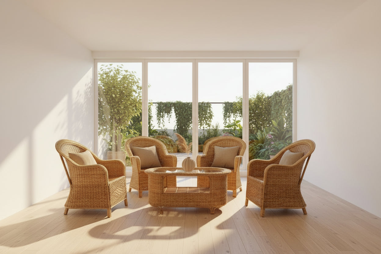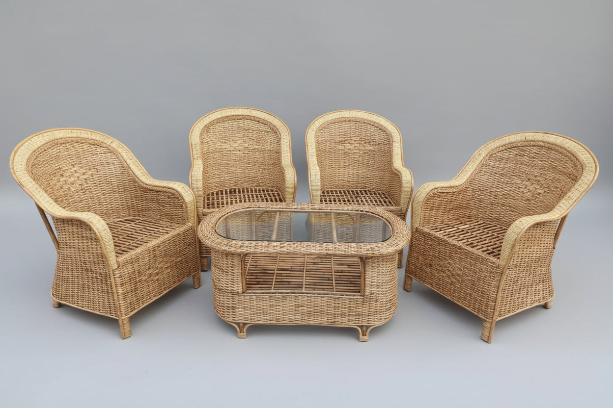 Introduce natural elegance to your living spaces with this handmade Bamboo Cane Sofa Chair set. Perfect for home, office, garden, and balcony, this set includes 4 chairs and a matching table for a complete seating arrangement. With a sturdy construction each chair also comes with a cushion for added comfort.